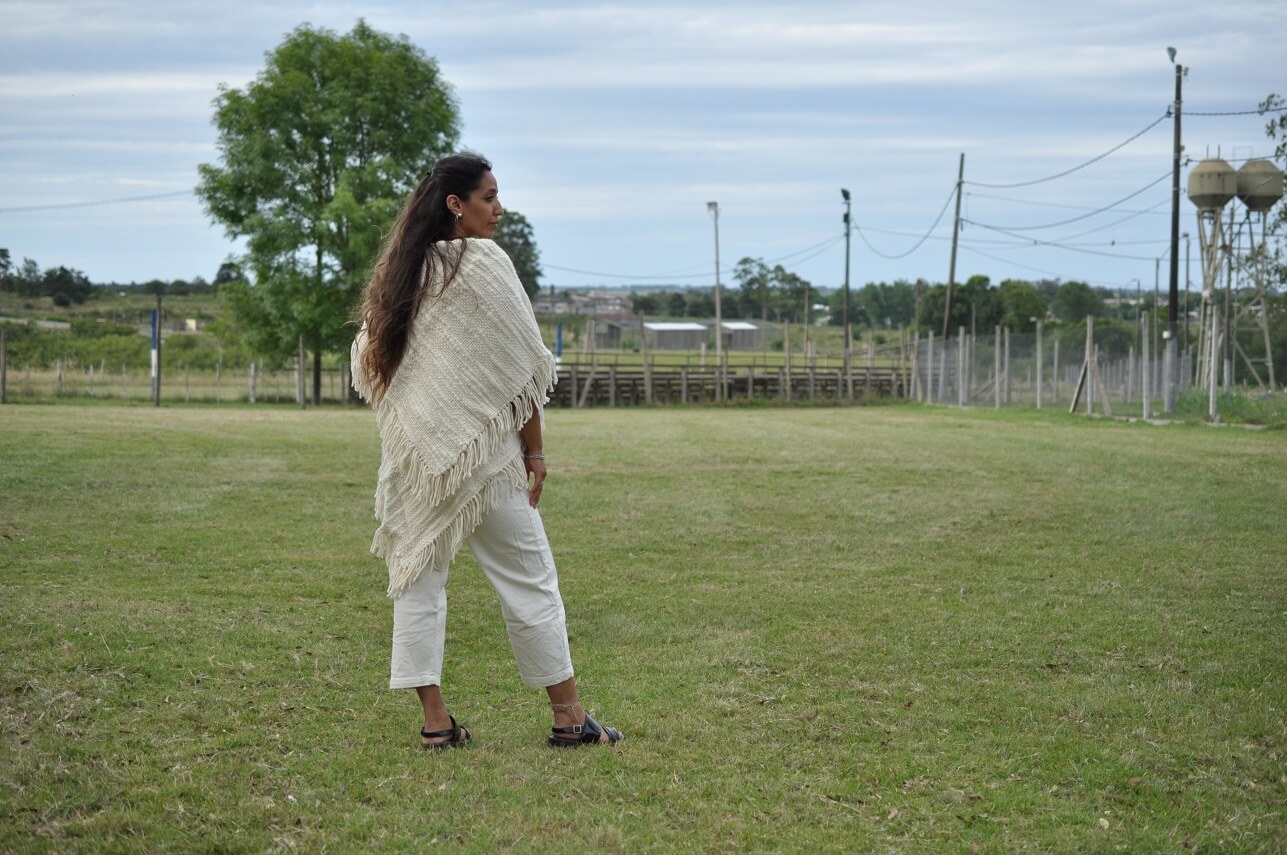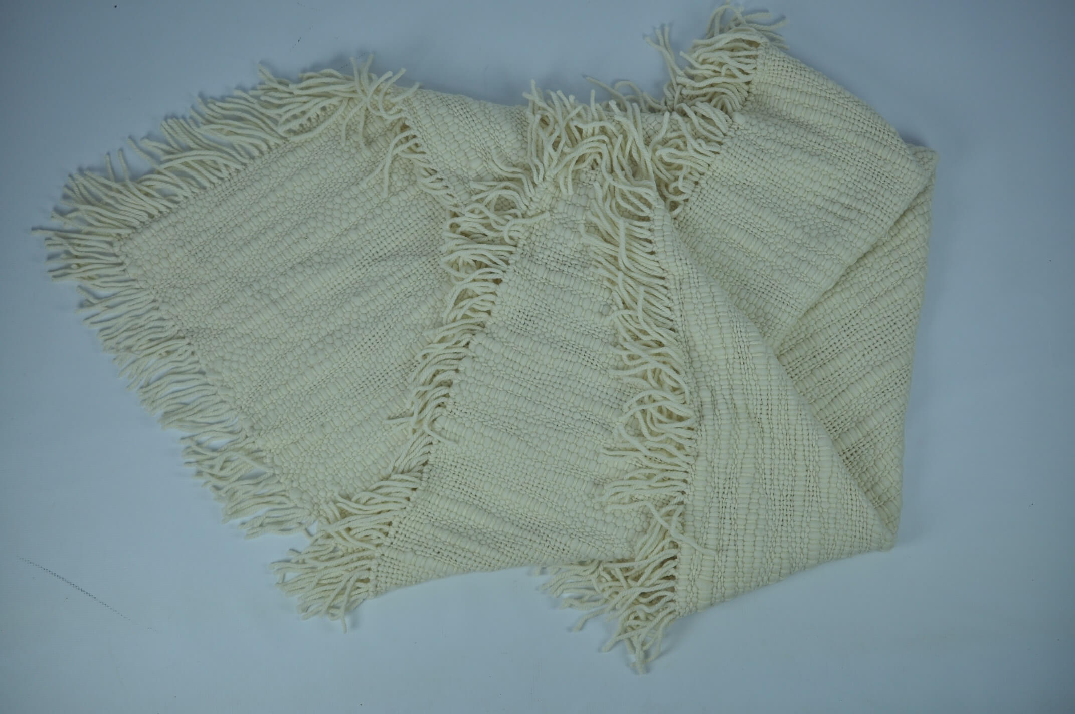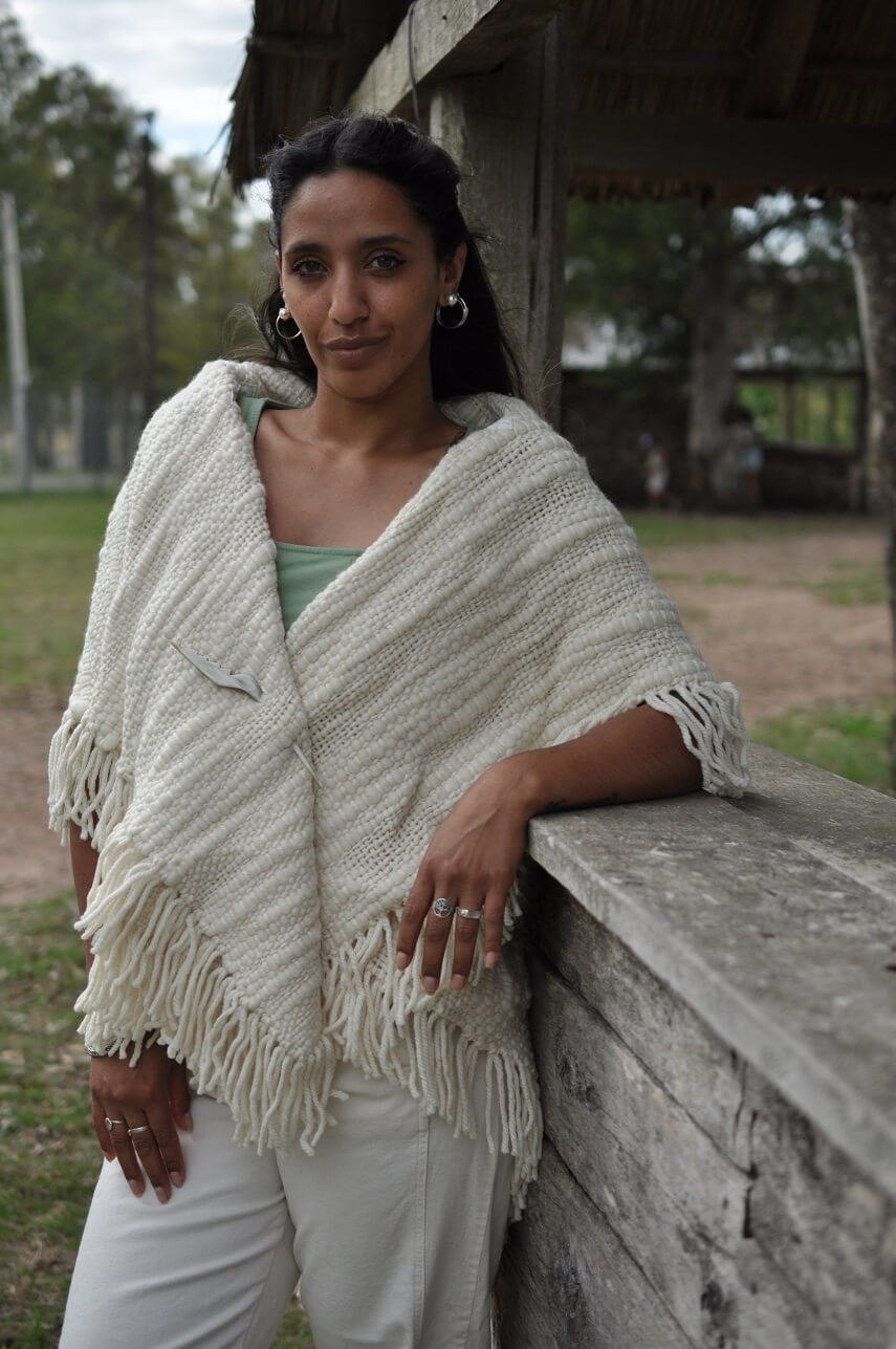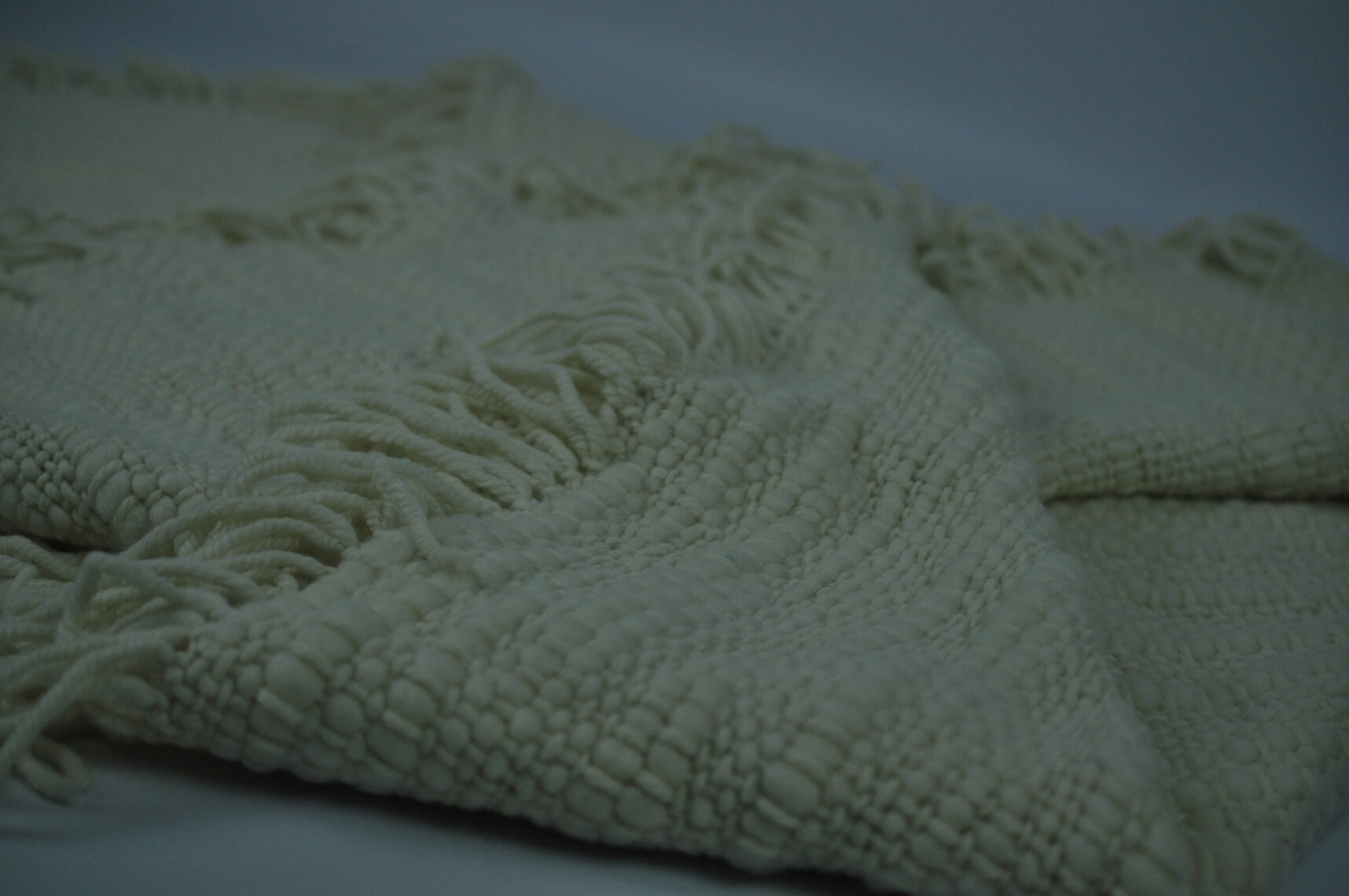 Medidas: 1.20 x 1.20, color natural confeccionada en lana merino, hilado flamé.