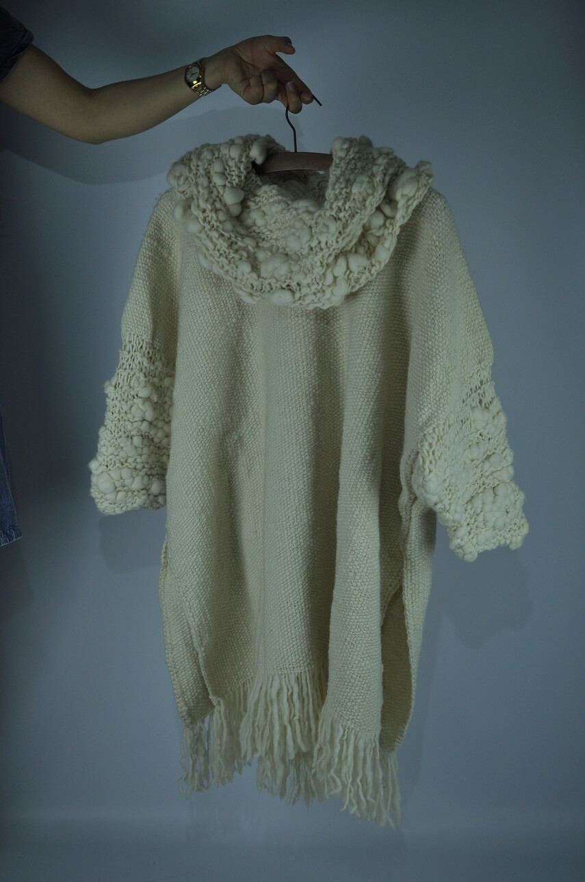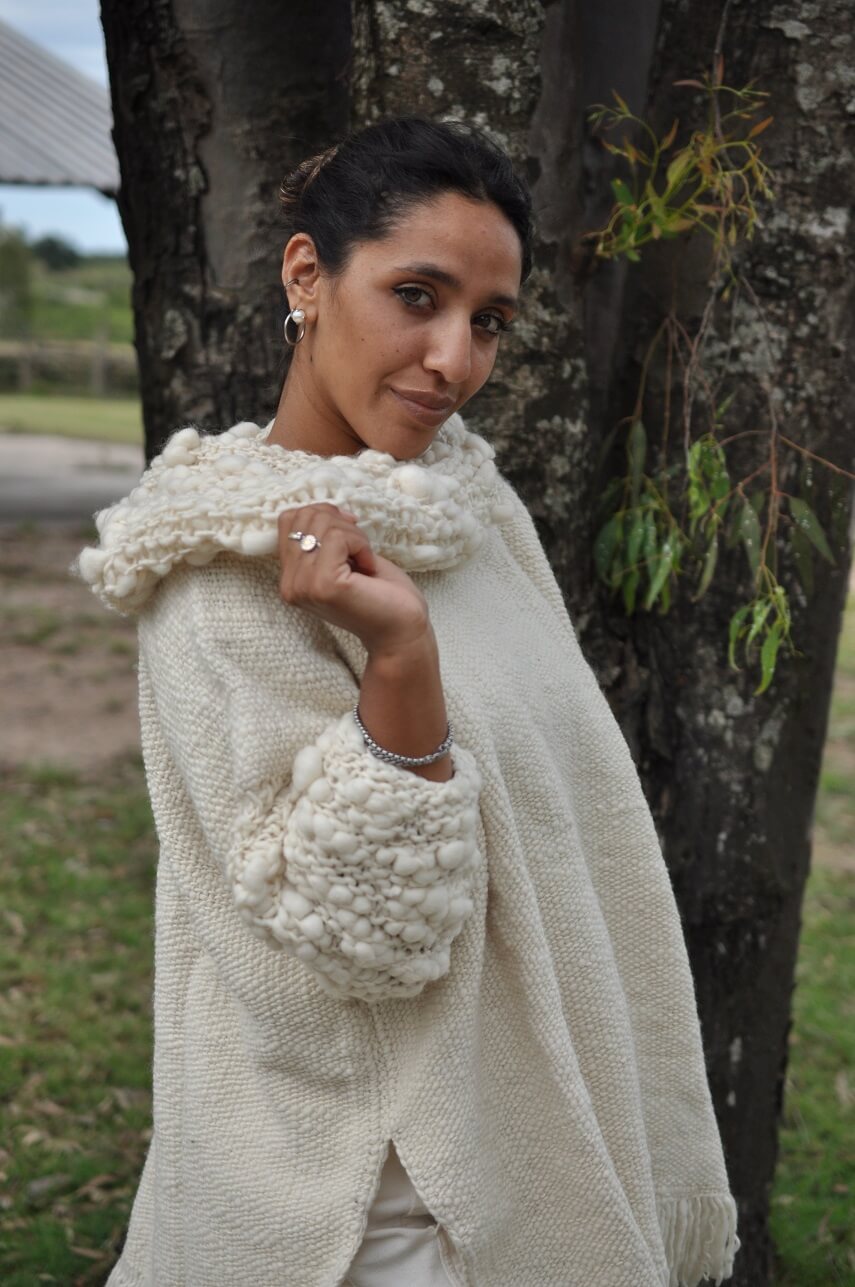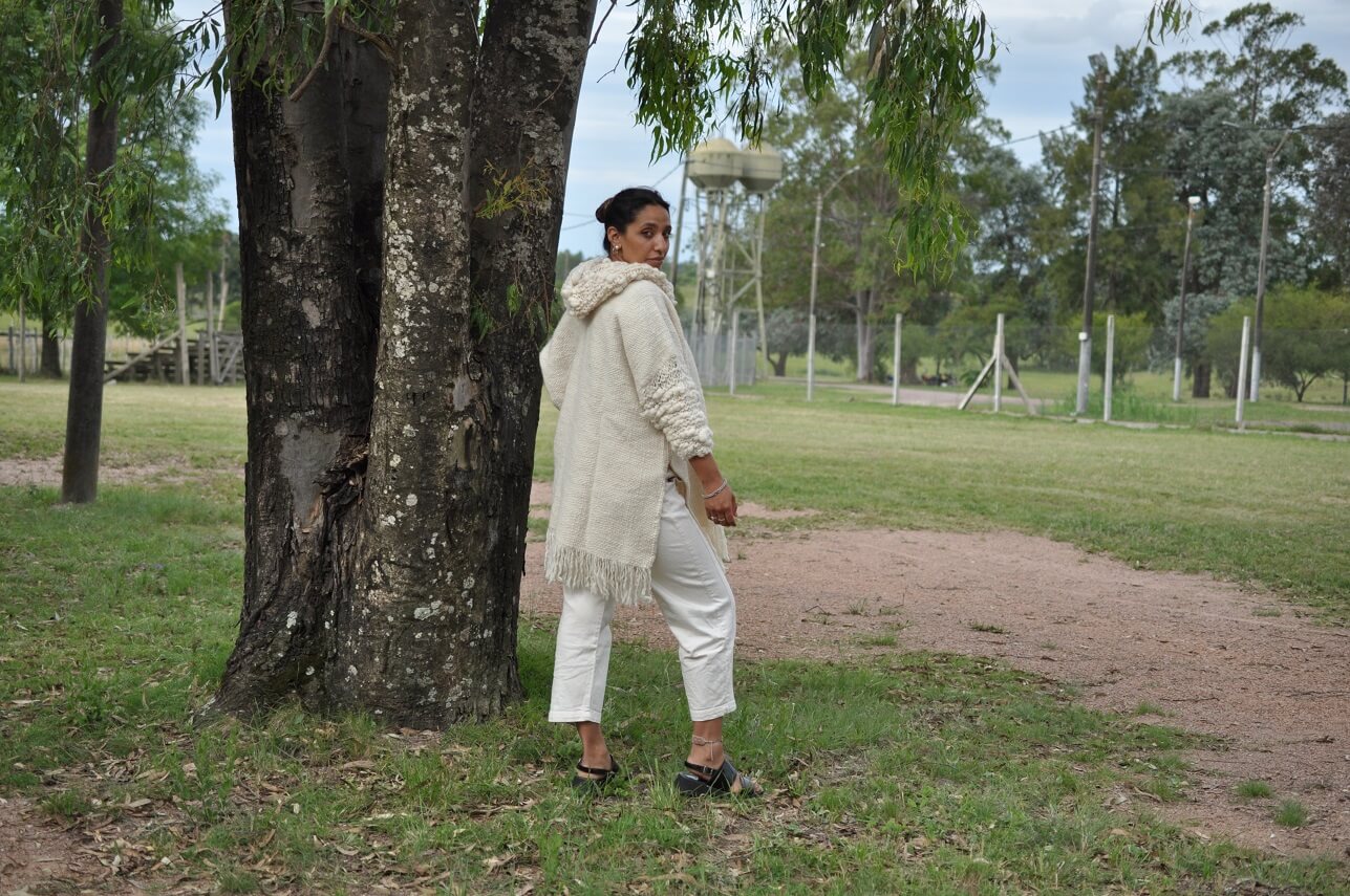 Medidas: 0.80 x 1.60. Confeccionado en lana merino, con mangas y cuello en flamé.